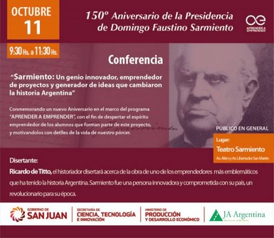 La charla se realizará en el Teatro Sarmiento, el día jueves 11 de octubre de 9:30 a 11:30 en el marco del 150º aniversario de la Presidencia del prócer sanjuanino.
